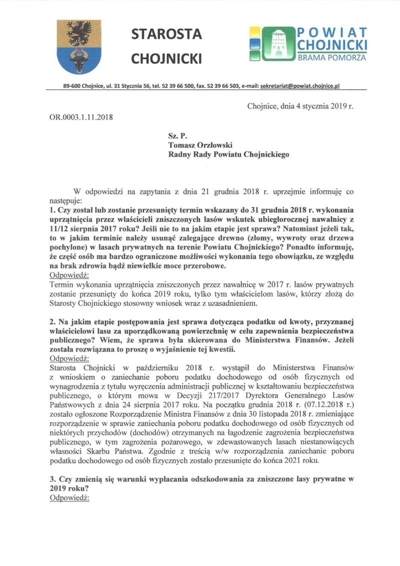 Odpowiedź Pana Starosty Chojnickiego Marka Szczepańskiego na interpelację radnego Tomasza Orzłowskiego w imieniu i sprawach właścicieli lasów prywatnych.