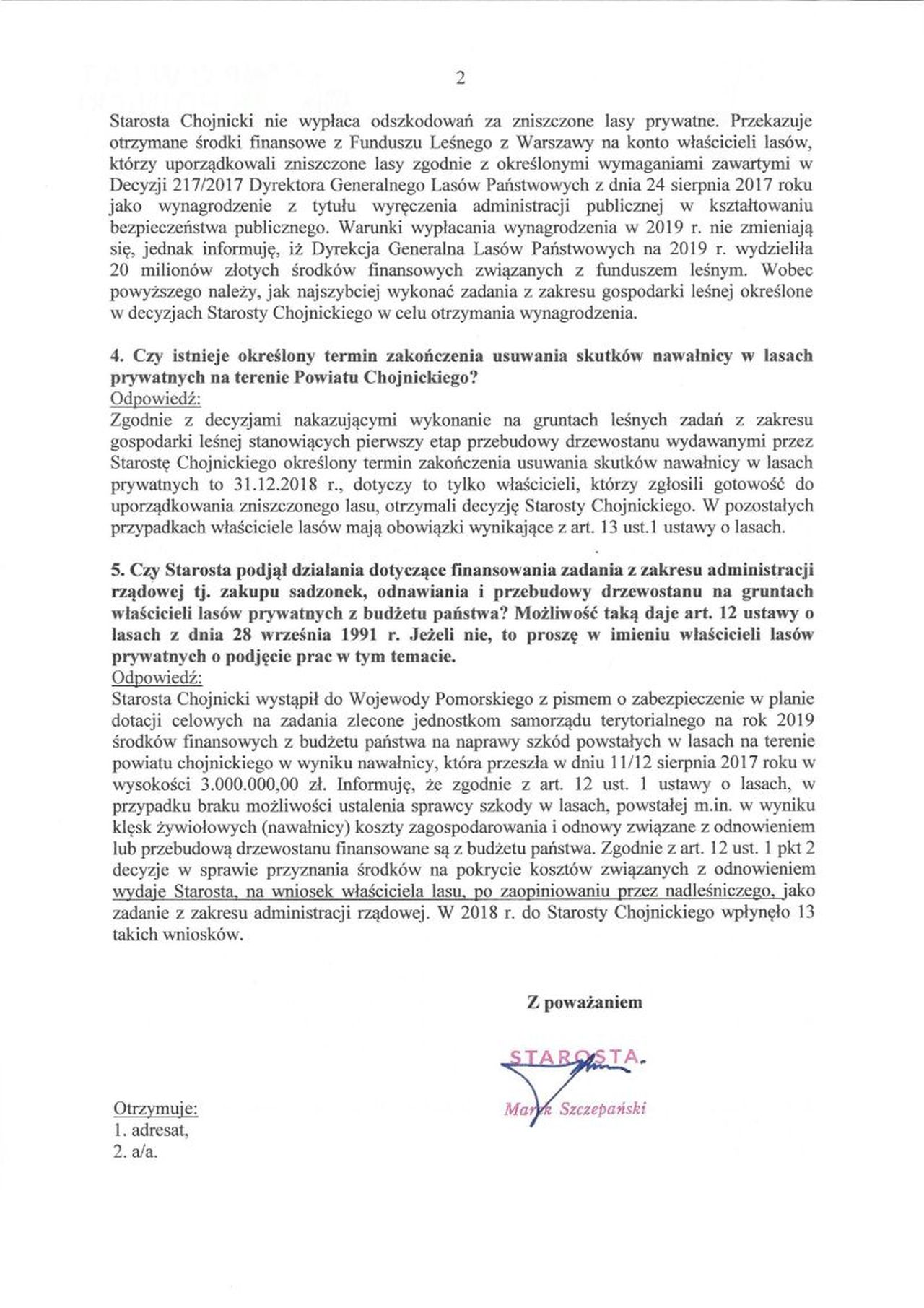 Starosta Chojnicki nie wypłaca odszkodowań za zniszczone lasy prywatne. Przekazuje otrzymane środki finansowe z Funduszu Leśnego z Warszawy na konto właścicieli lasów, którzy uporządkowali zniszczone lasy zgodnie z określonymi wymaganiami zawartymi w Decyzji 217/2017 Dyrektora Generalnego Lasów Państwowych z dnia 24 sierpnia 2017 roku jako wynagrodzenie z tytułu wyręczenia administracji publicznej w kształtowaniu bezpieczeństwa publicznego. Warunki wypłacania wynagrodzenia w 2019 r. nie zmieniają się, jednak informuję, iż Dyrekcja Generalna Lasów Państwowych na 2019 r. wydzieliła 20 milionów złotych środków finansowych związanych z funduszem leśnym. Wobec powyższego należy, jak najszybciej wykonać zadania z zakresu gospodarki leśnej określone w decyzjach Starosty Chojnickiego w celu otrzymania wynagrodzenia.