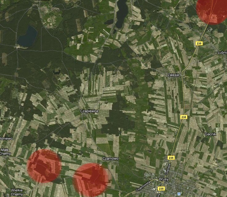 Przykładowe miejsce: kilkaset metrów od skrzyżowania Czapiewice-Wielkie Chełmy, Małe Chełmy-Brusy.