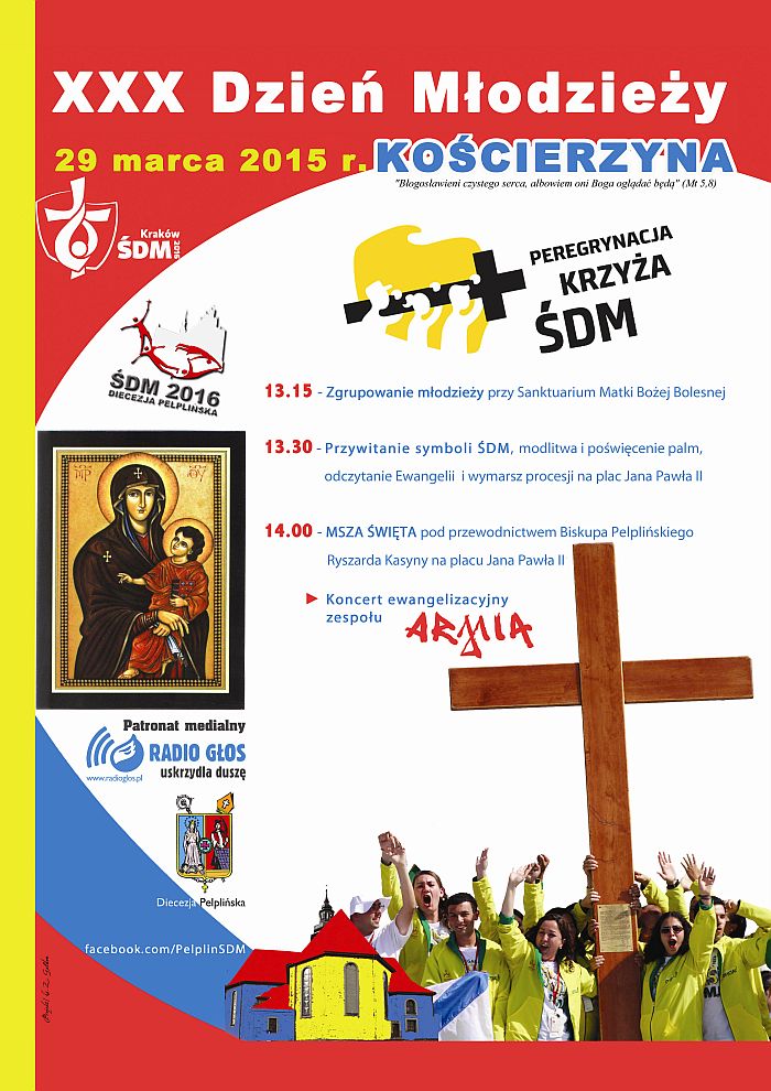 Tradycyjnie obchody rozpoczną się od odczytania Ewangelii przy Sanktuarium Matki Bożej Bolesnej. Następnie młodzi prowadzeni przez krzyż i ikonę przejdą na plac Jana Pawła II, gdzie zostanie odprawiona msza św. pod przewodnictwem J.E. Ks. Bpa Ryszarda Kasynę. Po Eucharystii nie zabraknie okazji do adoracji krzyża i Najświętszego Sakramentu. W programie znalazł się również koncert ewangelizacyjny. Tym razem na kościerskiej scenie wystąpi zespół „Armia.
