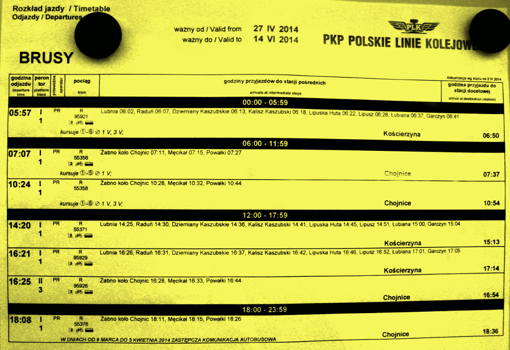 Od 27.04.2014 do 14.06.2014 na dworcu PKP w Brusach obowiązuje nowy rozkład jazdy pociągów: